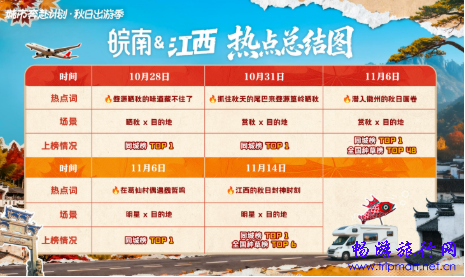 50余位跨界及垂类达人共同参与秋季种草内容创作,整体曝光量突破千万级别,覆盖江西上饶、安徽黄山15家重点头部商家,以多元化的内容视角与持续的内容输出,形成从点到面的内容爆发态势,推动江西#婺源晒秋的味道藏不住了 、安徽#潜入徽州的秋日画卷 等城市赏秋热点上榜,让江西与安徽两地秋景,以更生动的方式呈现在用户面前。