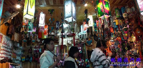 5月17日,几名游客在凤凰古城一处经营手工艺品的店内选购