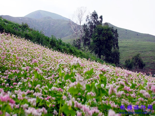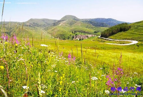山风徐来,花枝招展,随风摇曳,远处山坡的边线上,一簇簇的白色在游移着,那是放牧的羊群。生活在这儿的羊群应该是令人羡慕的,它们远离尘世,过着悠闲的原始的游牧生活,丝毫也不用为世间的复杂和多变而困扰,也不用为仕途和前途而担心。手持羊铲的牧羊人于蓝天白云之下,偶尔会铲一块花香郁馥的泥土向野跑着的羊群掷去,间忽,你还会听到他们那种旁若无人的山歌。