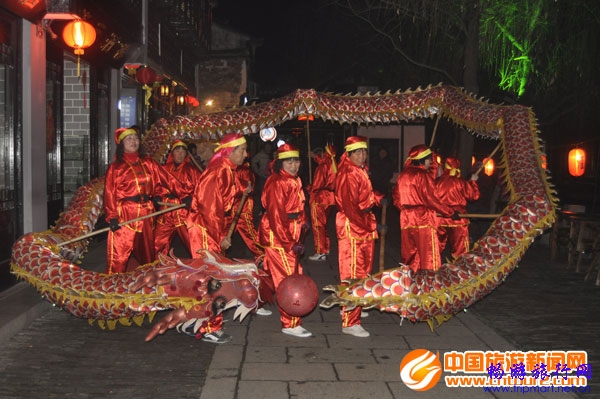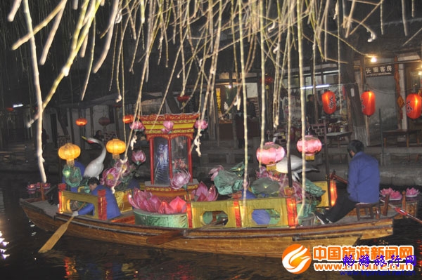 俗话说:“除夕的火,元宵的灯”,当天晚上,周庄景区内,各种花灯、街灯、提灯布满街市,金光璀璨。特别是古戏台,从门口到天井,从舞台到观演区,缤纷多彩的各式花灯形成了一个灯的海洋,踏入其中,赏灯、玩灯,惬意至极,不知何处才是阑珊尽头。台上一台精心准备的元宵晚会,看演出、猜灯谜、拿大奖,游客、镇民沉浸在一片欢乐祥和的气氛中。古戏台前鼓声震天,舞龙舞狮表演更是为元宵佳节加油助威。古戏台外水巷里,被叶楚伧老先生盛赞为“江南第一灯”的划灯精彩上演,两条满扎彩灯的船只,在弦乐声中缓缓划行,船中的灯还在不断旋转,波光流翠,煞是雅致。放河灯是另一项特色活动,沿河盏盏河灯借着水色,映着整条水巷霓虹透亮,好似天上银河。