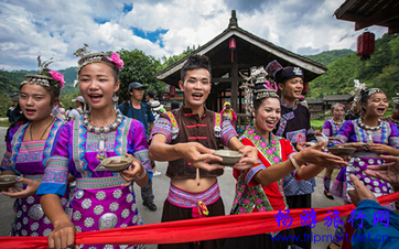 也许是大家都有颗热爱美食的心。从到达芋头侗寨开始,就没有停过吃吃喝喝。第一道门槛就是寨门口风雨桥畔的拦门酒。好几十位盛装的侗族姑娘手持红绸拦路,芦笙悠扬,歌声不停酒不停,注定了芋头侗寨之旅是一场醉美的旅程。