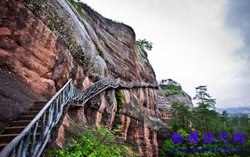 走在寂静的山中,眼睛总是被各种小东西吸引。山崖间突然“长”出来的一只爪子,暗绿色的苔藓上趴着的肥硕蜈蚣。空气中是南方的润湿,深深深呼吸,有种洗肺的感觉。这时候也走到了万佛山主峰的脚下。一长串依绝壁而建的栈道凌空而起,有种延伸到天上的感觉。定定神,开始挑战自我吧。