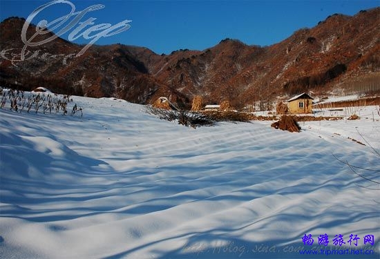 这天下午的天气相当好,阳光明媚,蓝天白云,白色的雪,黄褐色的山体。有趣的是,雪地里的雪被风吹成了波浪形状,大家管这个叫梯田雪,哈哈,自己发明的。