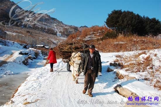 嘿,居然又是没有人守门!我们要了司机的电话作为后备,然后趁着没人卖门票赶紧进入景区。没有多久,走到高处,我们成功地走离售票处的视线,宣告免票成功!又省了30元,真是爽!看起来集安的冬天还真是冷门,冷门到连卖门票的都懒得出来售门票了。当然一路上的确没有其他游人,除了我们四个。景区里面只有拉着载柴草的人在走,正经的工作人员倒是没有的。