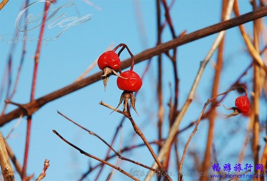 下了观景台,我们往回走,突然在路边发现了一种红色的小果子,在蓝天下红得发亮。
