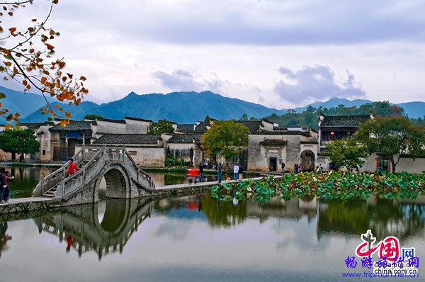宏村位于黟县城西北角,距屯溪65公里,距黟县县城11公里。该村始建于北宋,距今已近千年历史,原为汪姓聚居之地。古宏村人独出机抒开"仿生学"之先河,规划并建造了堪称"中华一绝"的牛形村落和人工水系,统看全村,就象一只昂首奋蹄的大水牛,成为当今"建筑史上一大奇观"。全村现保存完好的明清古民居有140余幢。民间故宫"承志堂"富丽堂皇,可谓皖南古民居之最。村内鳞次栉比的层楼叠院与旖旎的湖光山色交相辉映,动静相宜,空灵蕴藉,处处是景,步步入画。从村外自然环境到村内的水系、街道、建筑,甚至室内布置都完整地保存着古村落的原始状态,没有丝毫现代文明的迹象。造型独特并拥有绝妙田园风光的宏村被誉为"中国画里乡村"。