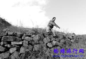 顺着石埂爬上将近100米,山坡上便出现一个石洞。该石洞顶部由一整块大石架起,洞口低矮,几乎与山坡齐平。钻进仅容一人进入的山洞,记者发现,除洞口一方外,洞内三面都是石壁,其中两面石壁被两条大石块支起,另一面石壁则用大量小石块垒起,码得整整齐齐,显然也是人工所为。