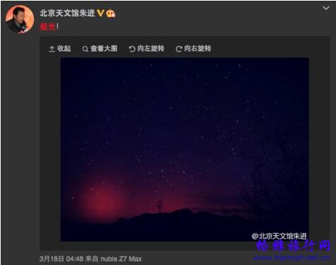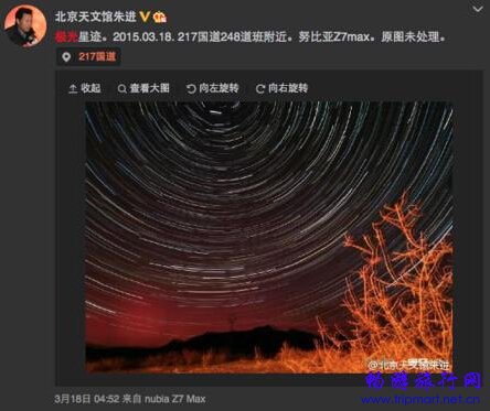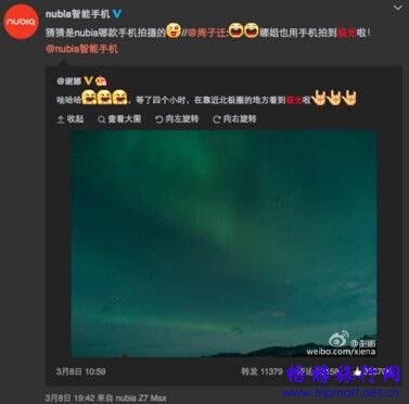 另外值得一提的是,知名主持人@谢娜3月8号在微博也晒出了一张极光图,目前努比亚官方已经确认,此张极光图同样是由努比亚手机拍摄。