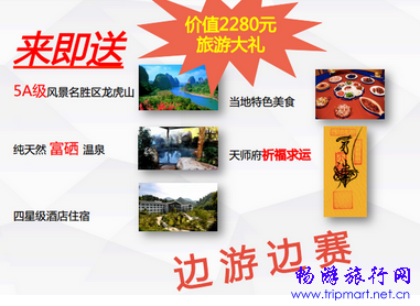 参与选手均有机会上电视、更有机会与明星来场挑战赛、更有总价值超过百万奖品等您来拿、进入区域32强后无需再支付报名费……如此诱惑的奖励,你可还能hold住?还嫌不够,那再加上价值2280元的旅游大礼如何?5A级风景名胜区龙虎山、纯天然富硒温泉、四星级酒店住宿、当地特色美食、天师府祈福求运这些都在向你招手哟,边游边赛其乐无穷!
