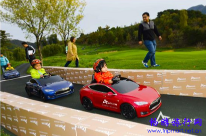 幸运家庭的宝宝驾驶极车公社提供的儿童版特斯拉进行竞速活动