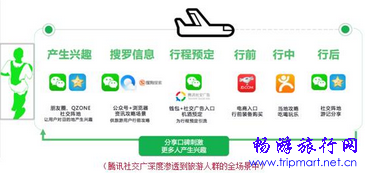 社交平台天然适合旅行者分享资讯、晒出旅游体验,旅行人群深度活跃在社交平台,形成一个天然与旅游行业相匹配的环境。QQ、微信作为已经覆盖90%中国网民的两大社交平台,占据中国移动网民55%+的上网时间,深度渗透旅游人群“产生兴趣-搜罗信息-行程预定-行前-行中-行后”的全场景中。