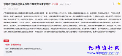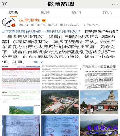 2020年12月6日,微博热搜榜上出现话题#东莞观音像维修一年多迟迟未开放,个中原因究竟为哪般?#,引起众多网友猜测:一个好好的生态文化旅游景区,为何东莞当地政府某些人就容不下呢?本来观音菩萨救苦救难,教人向善,可保国泰民安的,为何这尊观音像要被围挡一年多,不让游客朝拜?