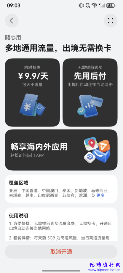 天际通9.9元/天多地流量随心用 落地即连网络不间断