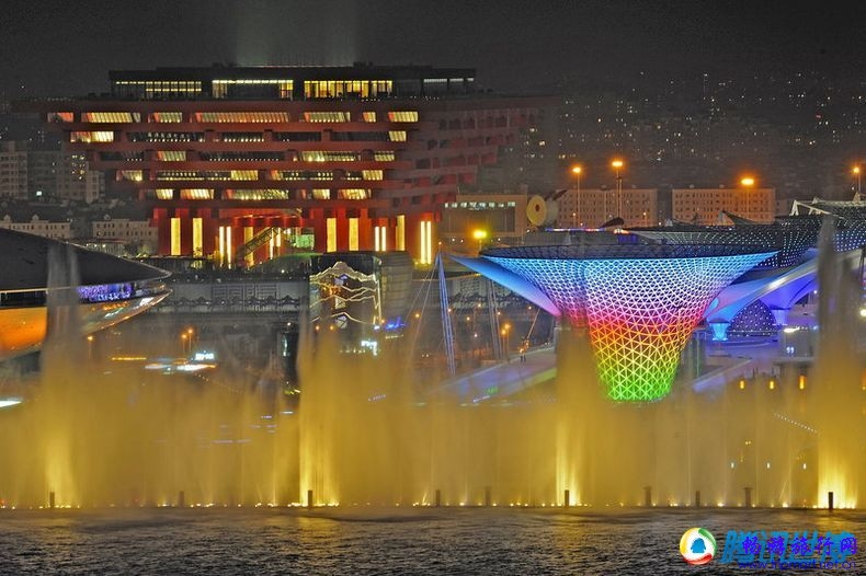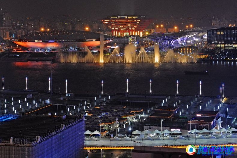 2010年4月17日晚,世博永久场馆进行灯光音乐水幕调试。为迎接4月20日举行的世博会首场试运营。上海世博会进入试运营冲刺阶段,入夜园区各场馆纷纷试灯,世博园的夜色更亮更美了。